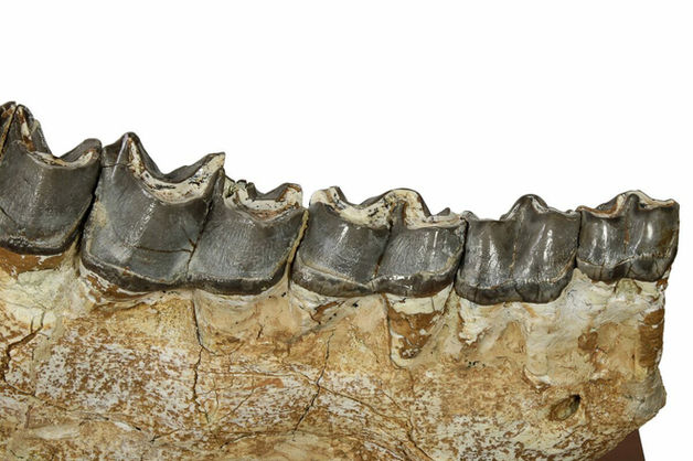 Typical preparation for large terrestrial mammal fossils. Gap fill restoration applied along the gum line below teeth and within repaired cracks throughout the jaw to ensure stability. The most significant restoration is present along the mandibular angle. All five original molars are preserved. Overall restoration is minimal and consistent with standard paleontological conservation practices.
